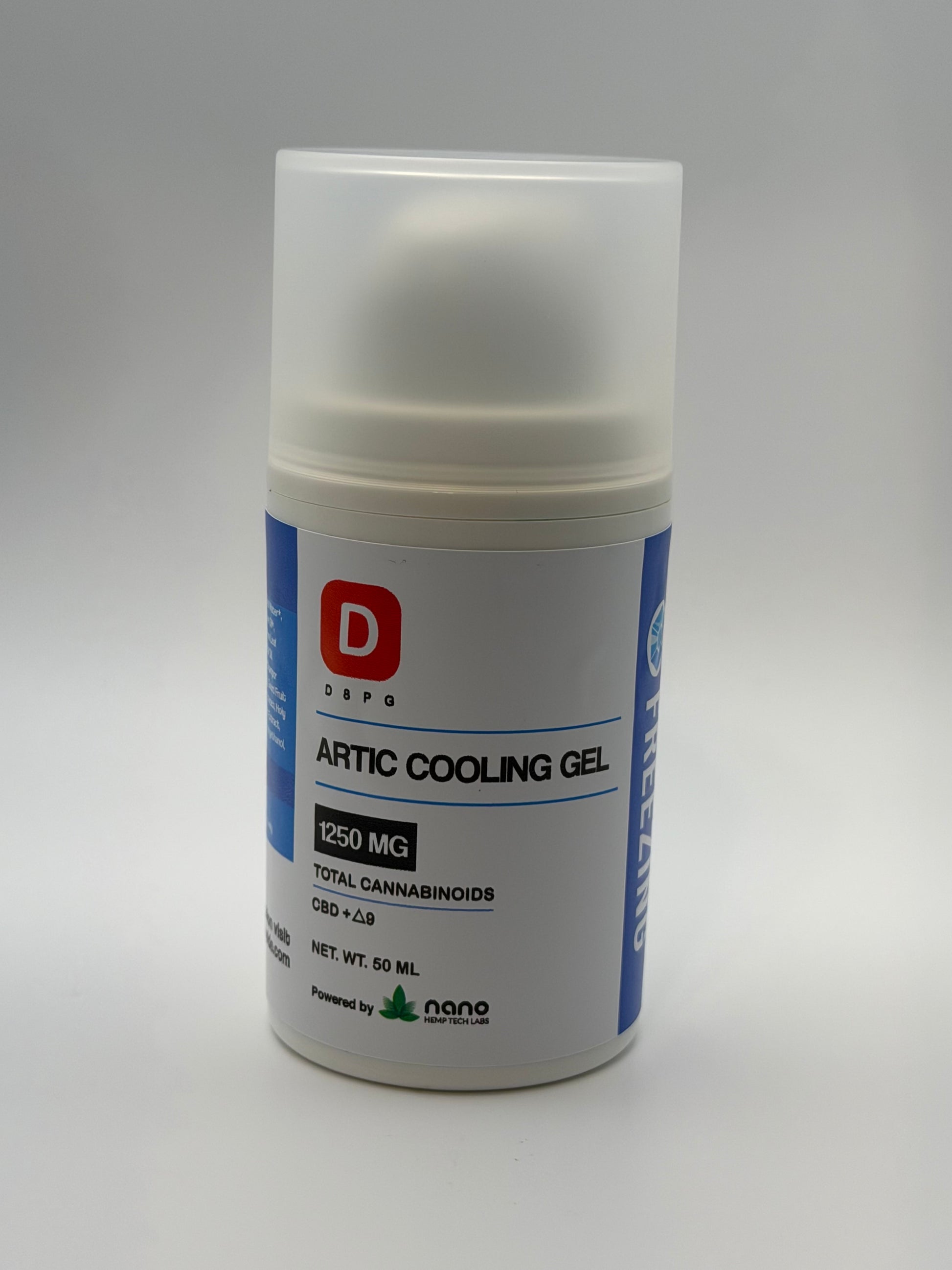 Soothe soreness and refresh your body with D8PG Arctic Cooling Gel, a powerful blend of CBD + Delta 9 cannabinoids formulated to deliver fast, targeted relief for muscles and joints. Infused with 1250mg of total cannabinoids, this advanced Nano Hemp Tech Labs formula penetrates deep to ease tension, reduce inflammation, and provide a long-lasting cooling sensation.